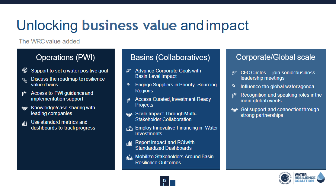 Water-Resilient Value Chain: Develop, implement, and enable strategies to support leading impact-based water resilience practices across the global value chain. Global Leadership: Raise the global ambition of water resilience through public and corporate outreach.
